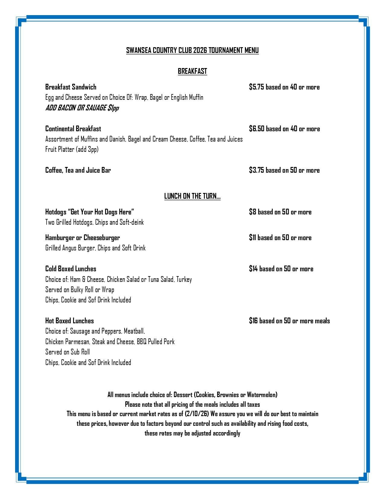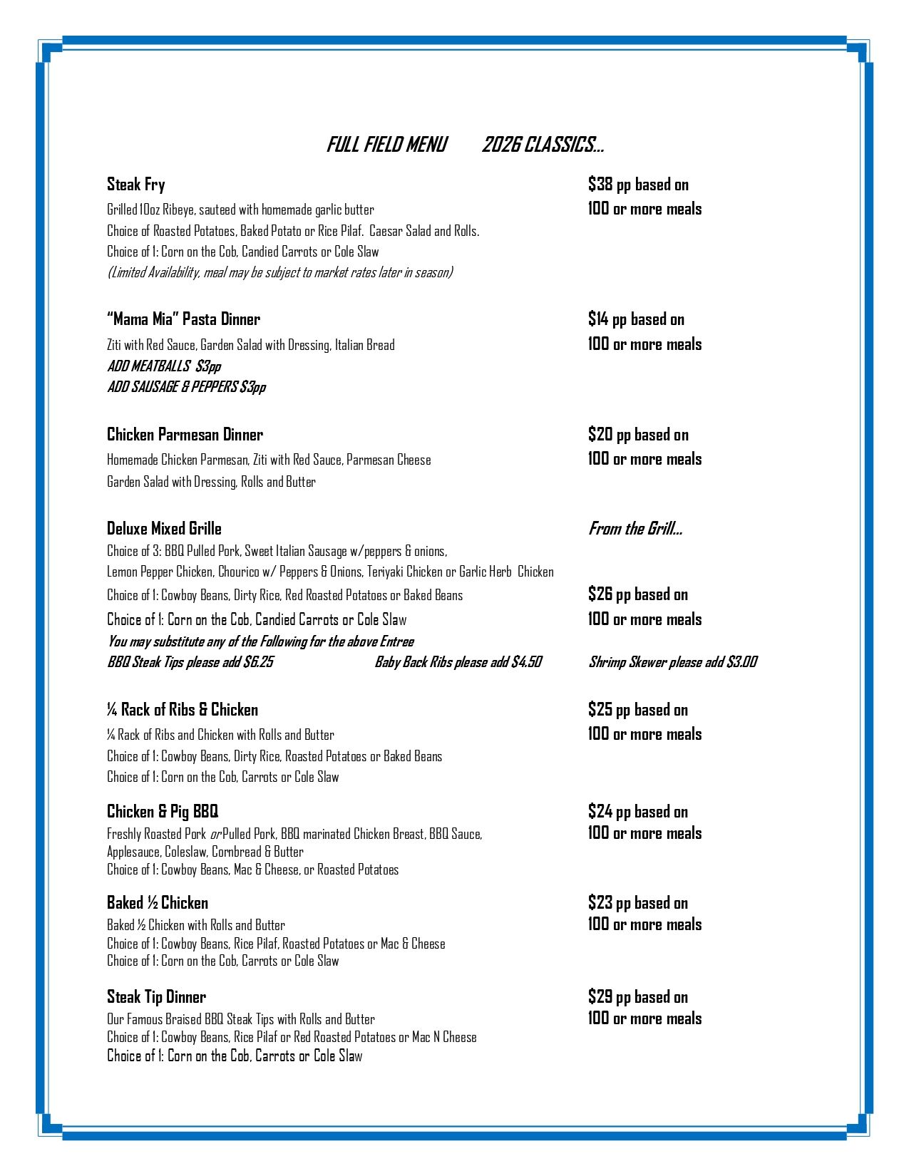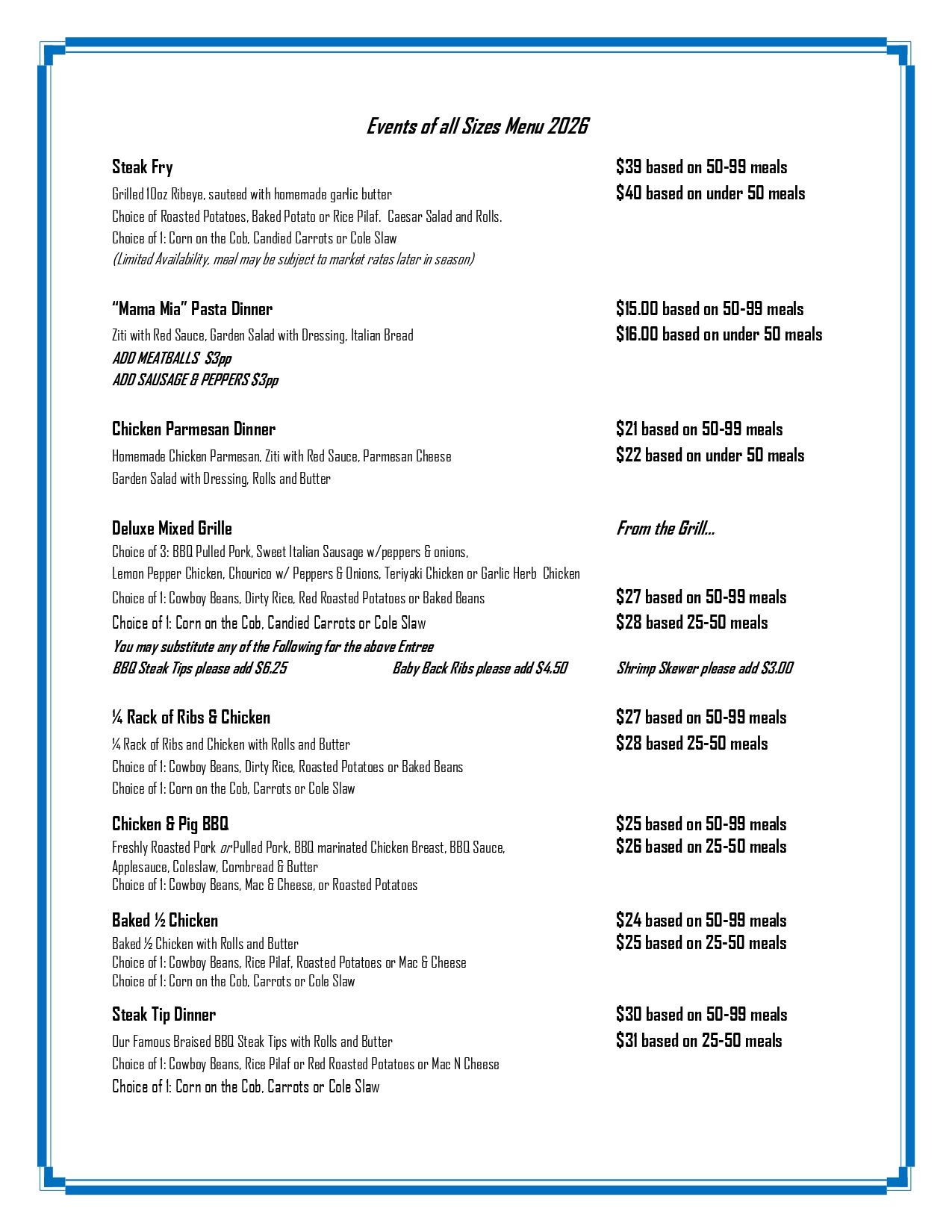 Whether you’re looking for a quick and efficient lunch on the turn or a fully customized dining experience following your round, our offerings range from classic grilled favorites and boxed lunches to elevated BBQs, steak tip dinners, and signature steak fry events. Each menu is crafted with quality ingredients, generous portions, and the ability to tailor selections to your group’s preferences—ensuring your outing feels both personalized and professionally executed.