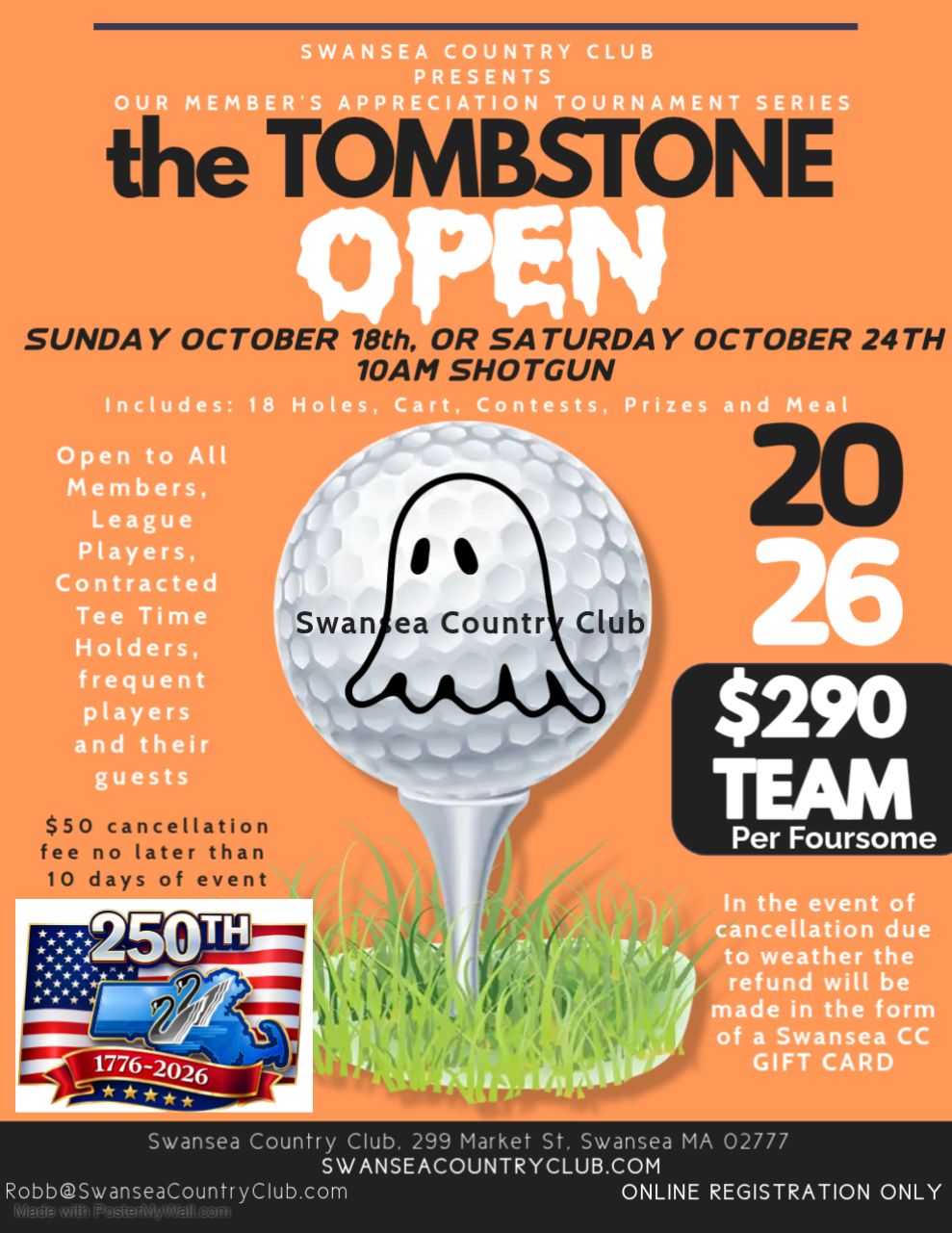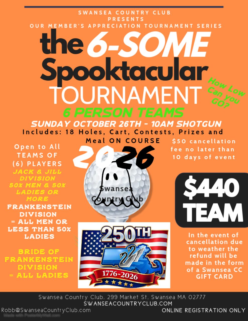 Easy Registration Online to reserve your foursome - Money due the day of the event. We play in any weather condition short of snow or rain so bundle up....